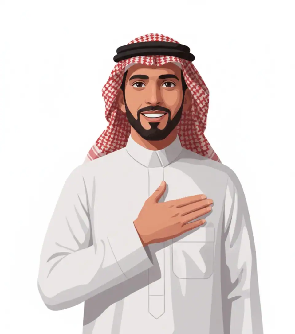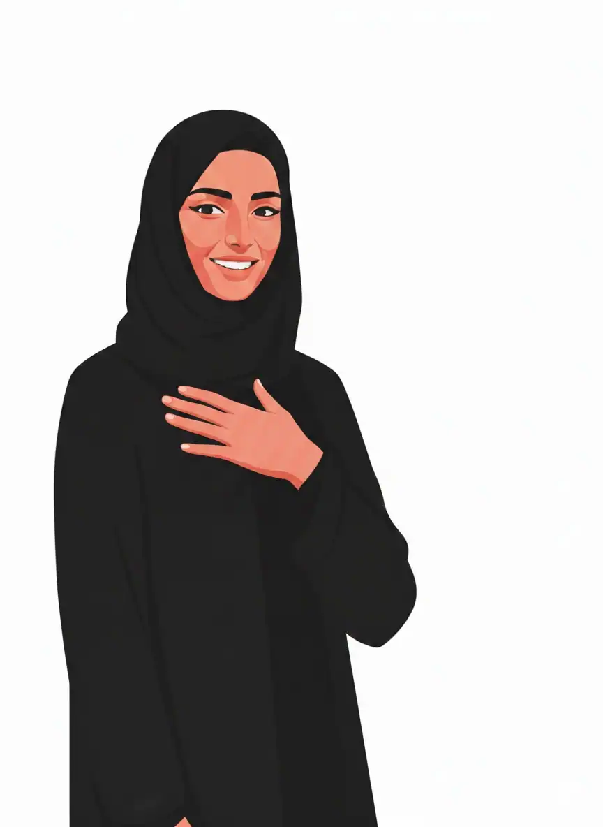 وضع اليد على الصدر مع ابتسامة هادئة وانحناءة خفيفة بالرأس.